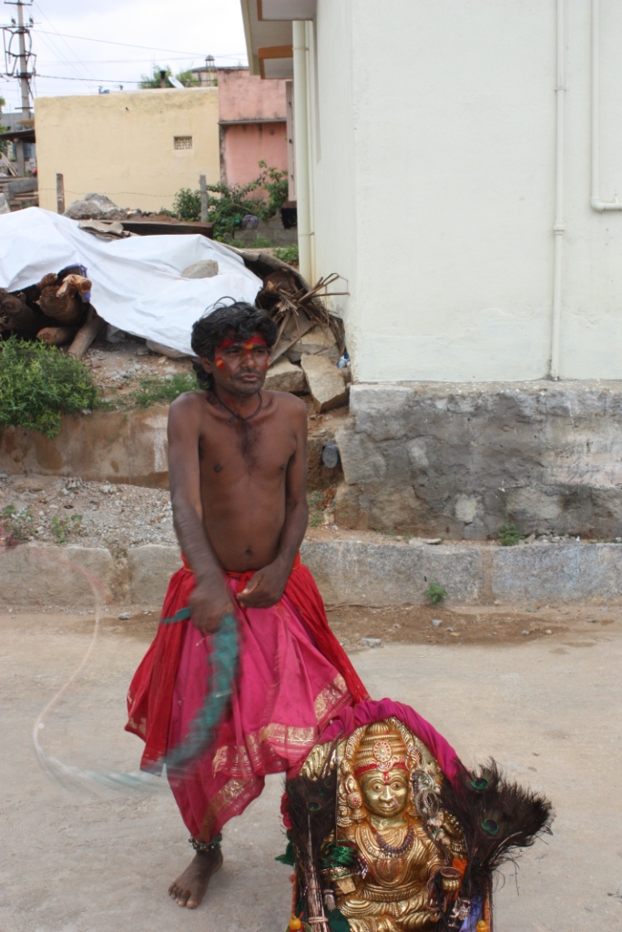 From the “only-in-India” files, here are a couple of photos a of a man who travels door to door whipping himself–or rather pretending to–with the accompaniment of a bongo soloist–to make it groovier, I presume. The lower photo is mid whip-crack, and the top one gets the bongoist in the picture.
