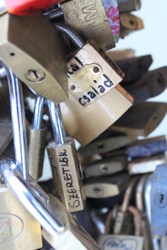 Love locks are padlocks that people hang in a public space as a sign of affection–often with a message written on them. Some are fancy; others are not. It reminds me of the Shinto prayer boards one sees in Japan. Love locks are a pretty common phenomena, particularly in Europe. The first ones I remember seeing were in Helsinki, but this wall is in Pécs, Hungary.