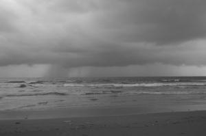 is boxed by rain, low clouds, and rising waves.