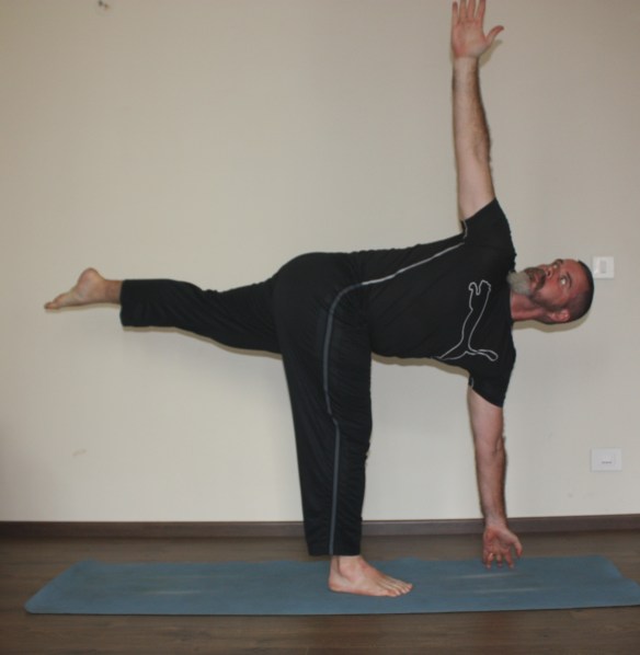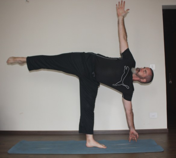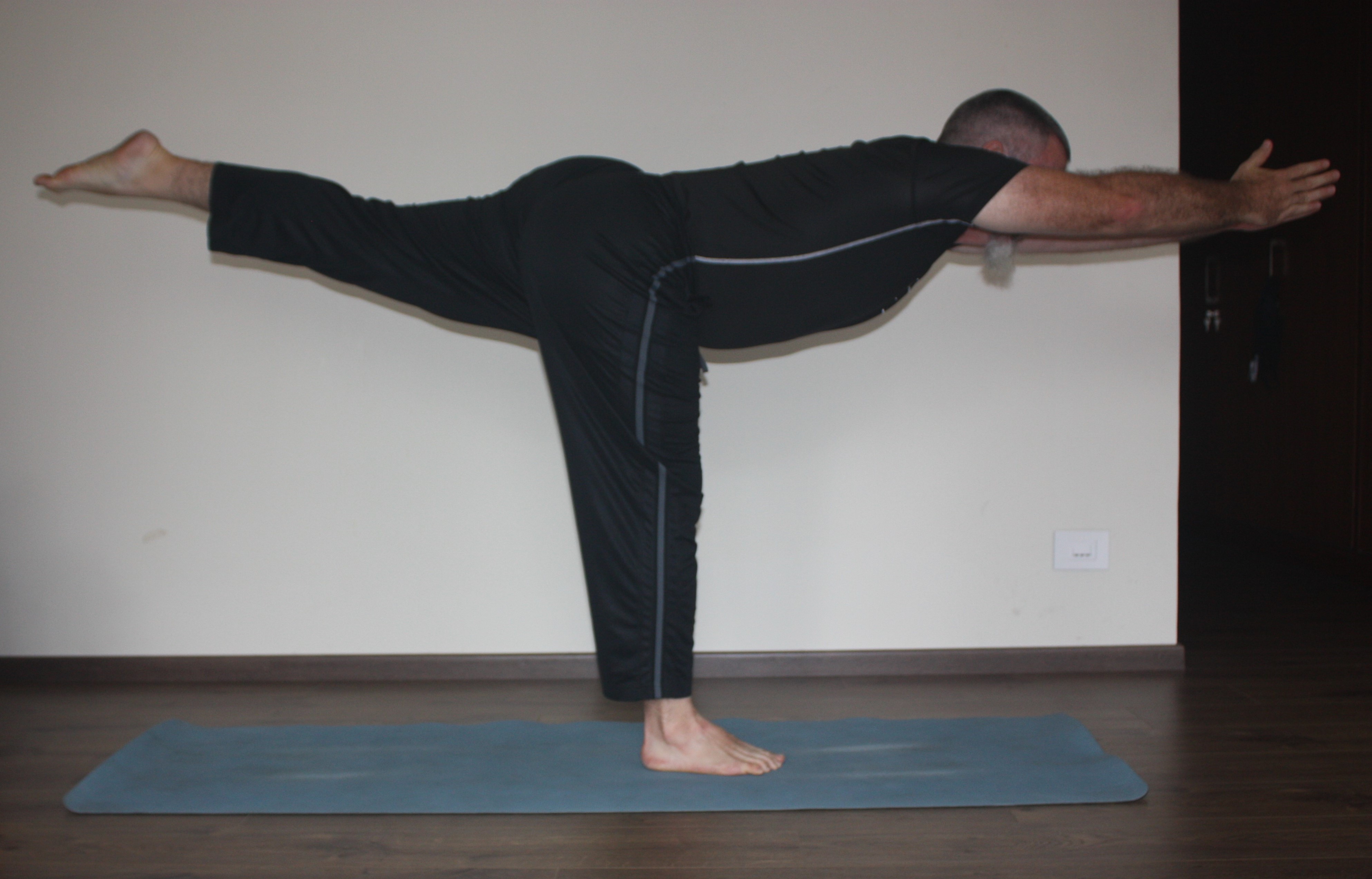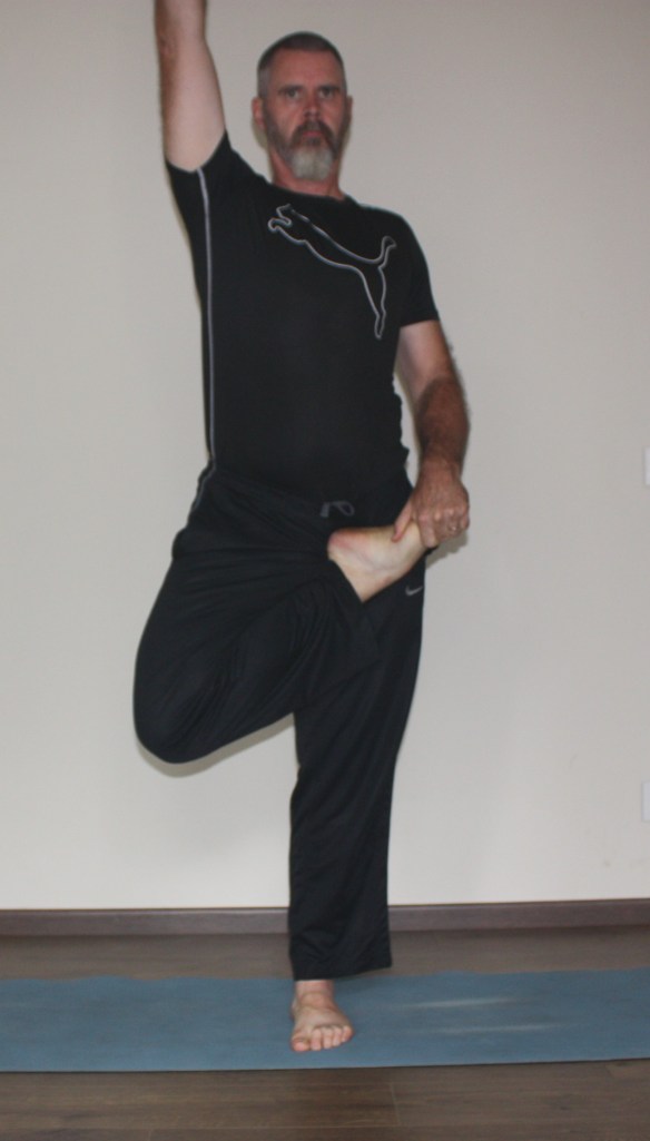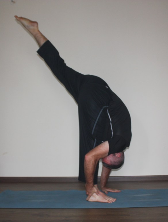 Straightening the lifted leg without throwing oneself off balance is the big challenge. It’s possible to put both hands around the support leg ankle, to make it even more challenging, but one must have an exit strategy in case one loses balance.