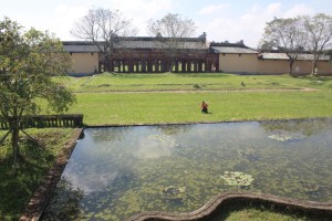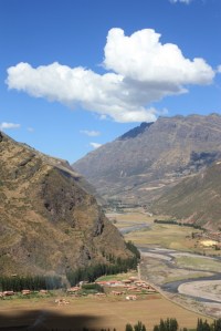 From down the valley strait.
