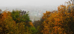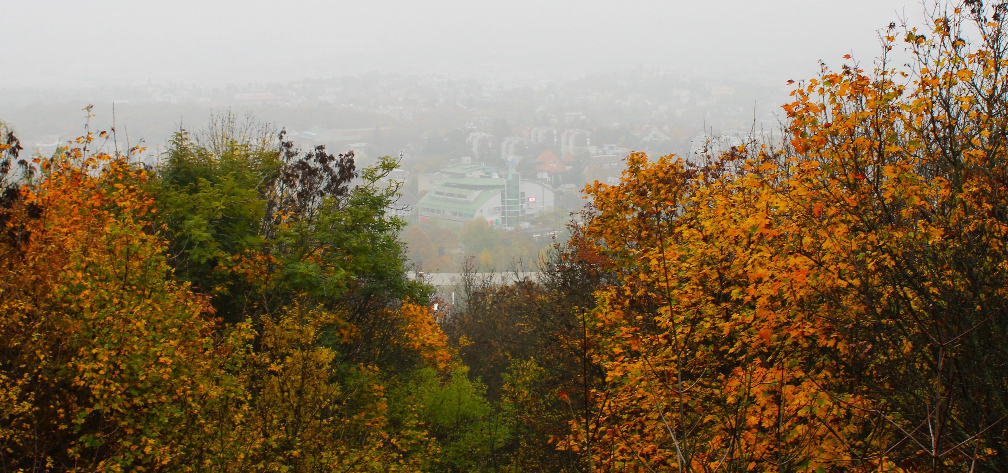 the foggy valley looks like a depthless painting through fall foliage.