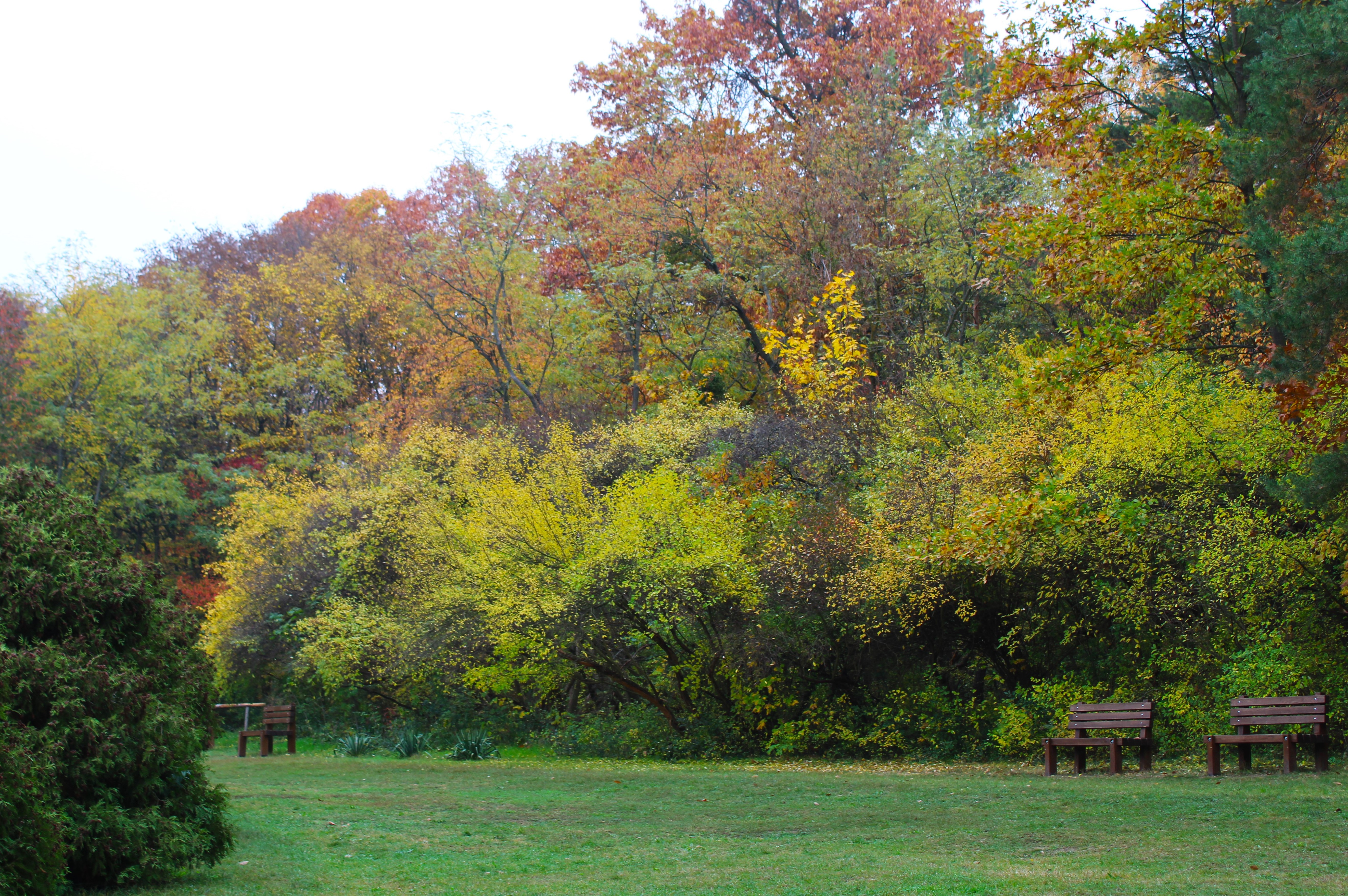 The forest looks painted with dabs of bright color, a pointillist mural of the leaves' last hurrah. Soon, it'll turn twiggy, and sing desolation, and invite the fog in to soften sharp lines. Then one day you'll notice leaves glowing in sunlight. Their green will be golden from warm yellow rays. The maturing forest will darken its greenness, turning to sober tones that blot out the light.