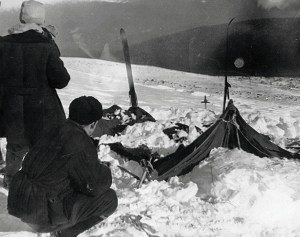 The Facts: In January of 1959, nine experienced hikers set out on a trek in the Ural Mountains. When they didn’t return when they were supposed to in early February, a search party was dispatched. Because these were knowledgeable outdoors-people and they’d left a route-plan, it didn’t take long to find their tent (as shown) and soon thereafter they started to find the first of the trekkers’ corpses. Though it took more than two months of searching to find the last four.