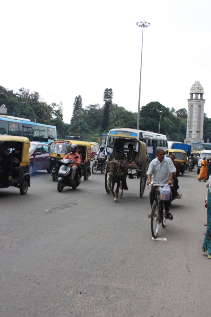 When I first moved to Bangalore, I would have thought the street above couldn’t be crossed. However, I’ve now learned that one has to take advantage of the speed differential between the bikes and livestock on one hand and the motorized vehicles on the other to get one’s foot in the door. Then one has to cross in stages, with vehicles whipping passed to fore and to the back. It’s like getting vaccinations with the cattle gun in the military, you take a step forward and stop precisely. Except, instead of getting a gash in one’s arm, the penalty is being pelted with a rear-view mirror. It’s the only way, really.