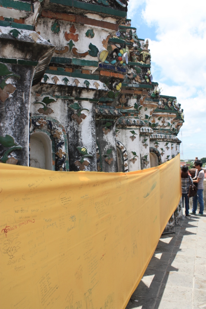 When I visited Wat Arun last year, this banner was wrapped around one of the upper tiers of the temple. It contained messages from around the world in various languages. It functioned like the prayer boards that one sees at Shinto shrines in Japan. One can’t really see it from ground level.
