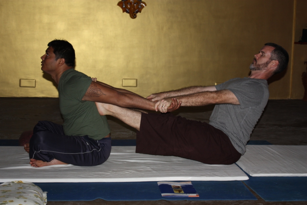 When I moved to India, I began the study of Thai Yoga Bodywork (TYB.) In Thailand it’s usually just called Thai Massage, and in both India and Thailand some call it Nuad Bo Rarn. This system of bodywork is said to have its roots in Northern India about 2500 years ago with a doctor named Jivaka Kumar Bhaccha (aka Shivago Komarpaj.) It involves a combination of assisted stretching and acupressure massage–imagine a lazy person’s yoga meets Japanese Shiatsu or Chinese Tui na. In Thailand, the methods were synthesized with indigenous healing arts and perfected.